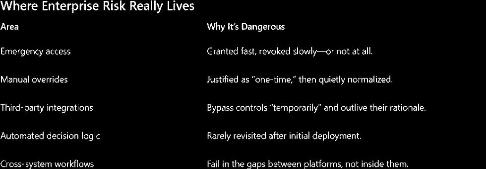 In that environment, "the system wouldn't allow that" is almost meaningless. One system might block something while three others quietly permit it. Most risk programs miss this because they audit systems one at a time instead of looking at how outcomes actually flow end-to-end.
